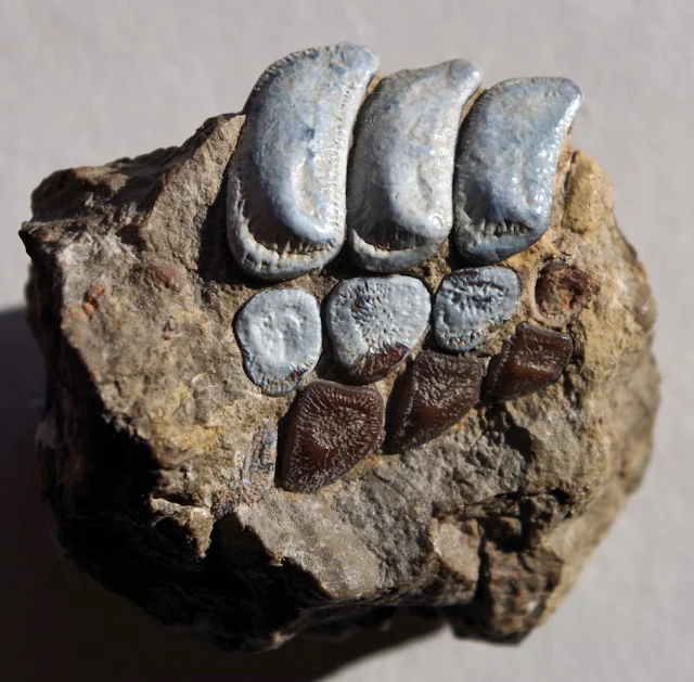 Estas placas dentarias tan especiales les servían para romper las duras conchas de los moluscos y otros invertebrados dotados de caparazón. Sin duda alguna estaban perfectamente adaptados a este tipo de alimentación. A pesar de que estas placas se citan como relativamente frecuentes, yo no las había visto nunca hasta que la encontré hace bastantes años (hace 33 años). El aspecto azulado de los dientes me hizo pensar que estaba delante de un paquete de tabaco tirado (Ducados, para ser más concreto), pero se trata de la meteorización parcial de las piezas dentarias expuestas a la intemperie, que adquieren un color azulado. En cambio las que aparecen de color marrón estaban ocultas por la caliza y surgieron al desincrustarlas.